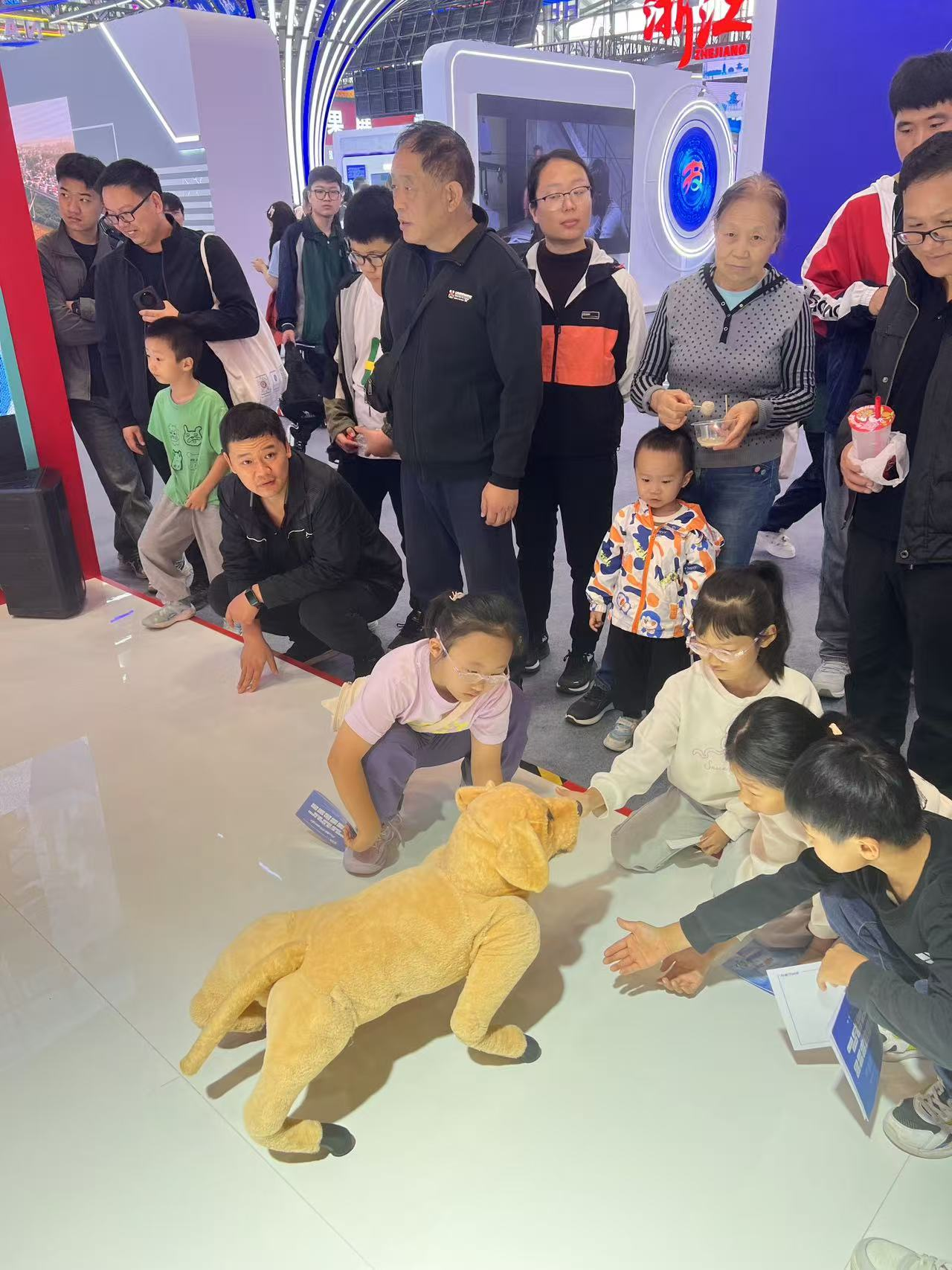 起立、坐下、转圈、抬爪……北京展区的另一个“小伙伴”最受小朋友欢迎。前来参观全国技能成果展的小朋友们争先恐后地想和海厚泰智能科技有限公司的氢能机器狗“握手”。
