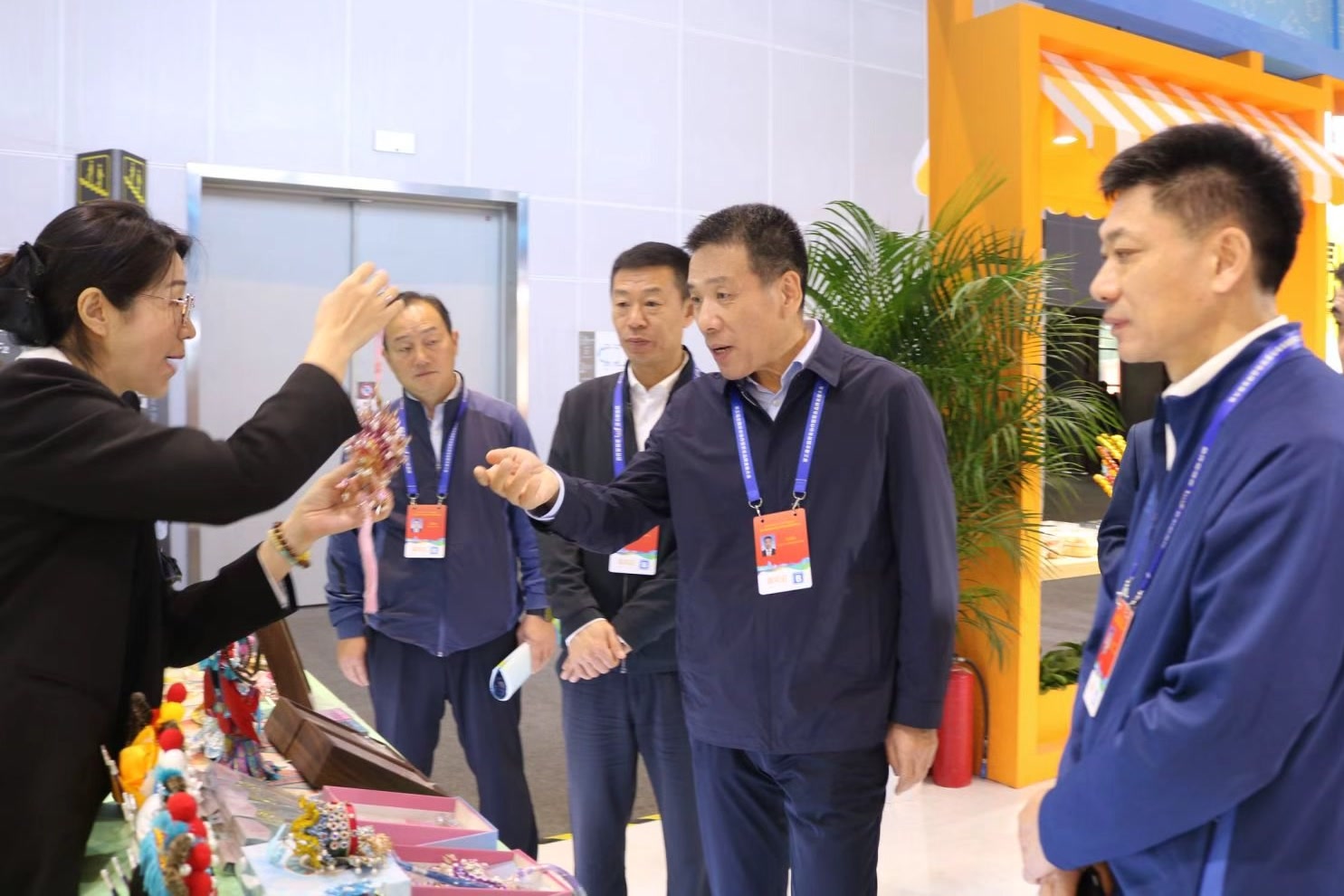 北京市人社局党组书记、局长王清旺(右二)在现场了解“通州绢人唐娃娃制作师”劳务品牌制作工艺