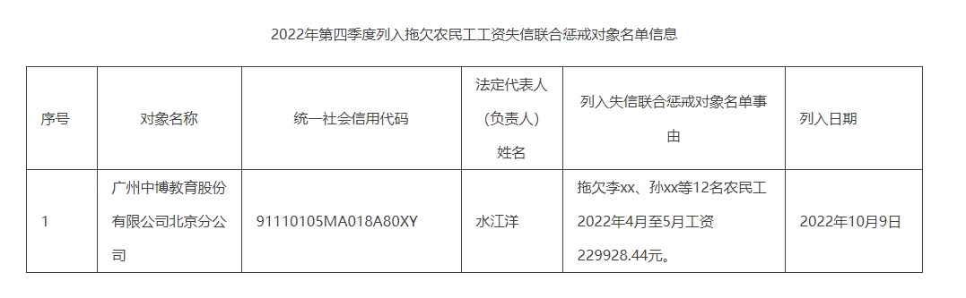 北京:一企业被列入拖欠农民工工资失信联合惩戒对象名单