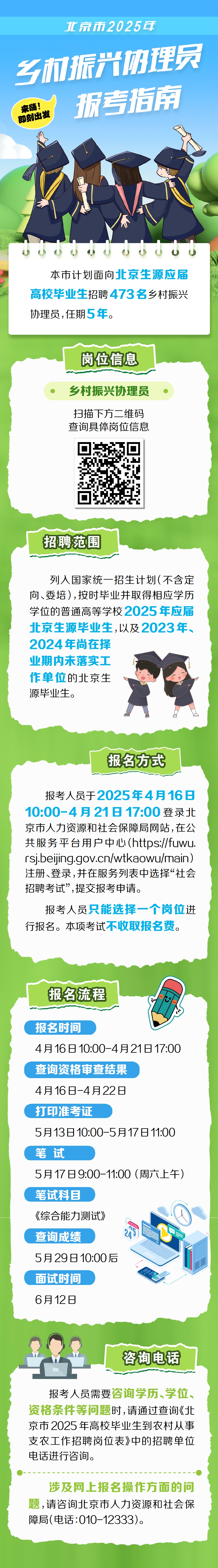 央广网北京4月15日消息(记者 庞婷)4月15日,北京市人力资源和社会保障局发布《北京市2025年高校毕业生到农村从事支农工作招聘公告》,启动2025年乡村振兴协理员招聘工作。今年,北京市将招聘473名高校毕业生担任乡村振兴协理员,到农村从事支农工作。报名时间从4月16日10时开始,4月21日17时结束。这是北京市落实中共中央组织部、人力资源社会保障部等关于实施高校毕业生“三支一扶”计划要求的重要举措。