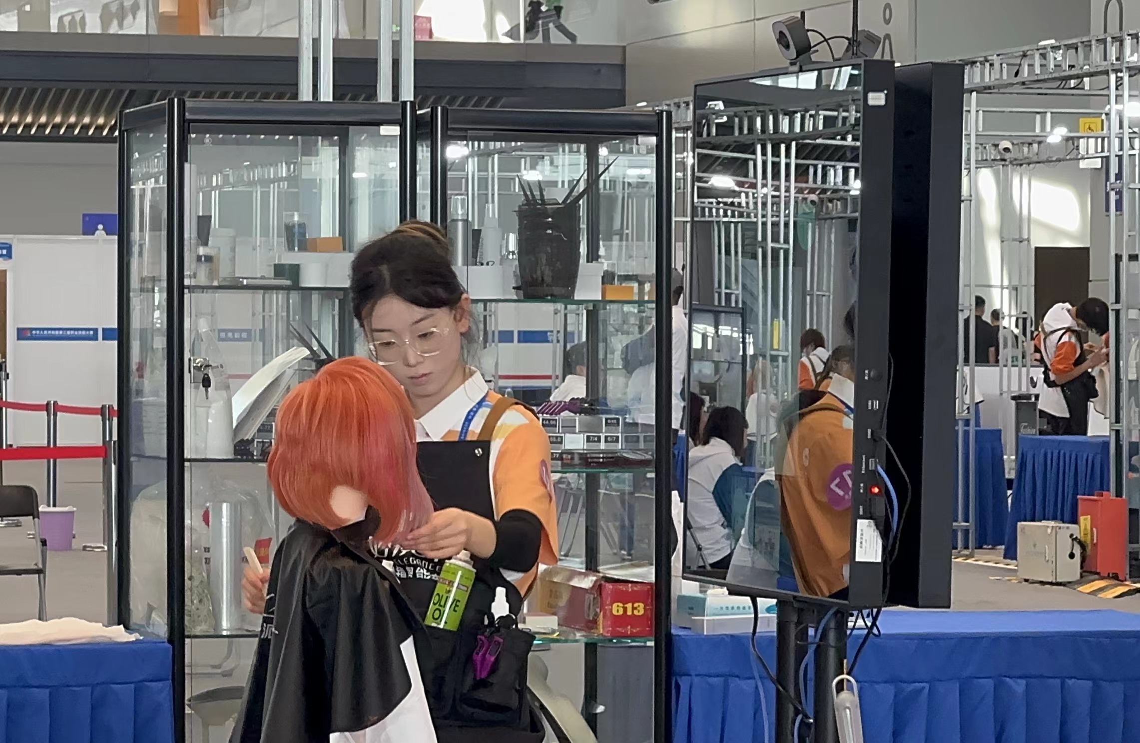 比赛首日,大赛106个比赛项目同时开赛,记者在美发项目赛场看到,北京参赛选手王海英正在按照赛题,设计一款极具造型感的发型。