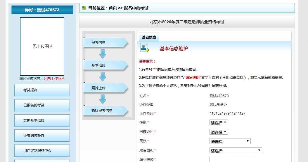(7)上传照片。按照规定上传本人近期二寸蓝色背景、免冠证件照片(400×600像素以上),要求格式为jpg或jpeg,大小为35-100KB之间。