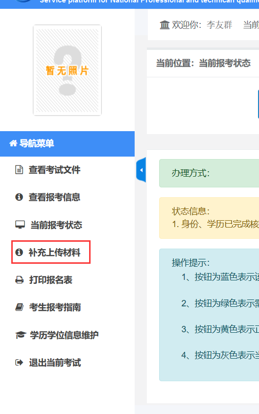 ③选择“补充上传材料”栏目,上传材料